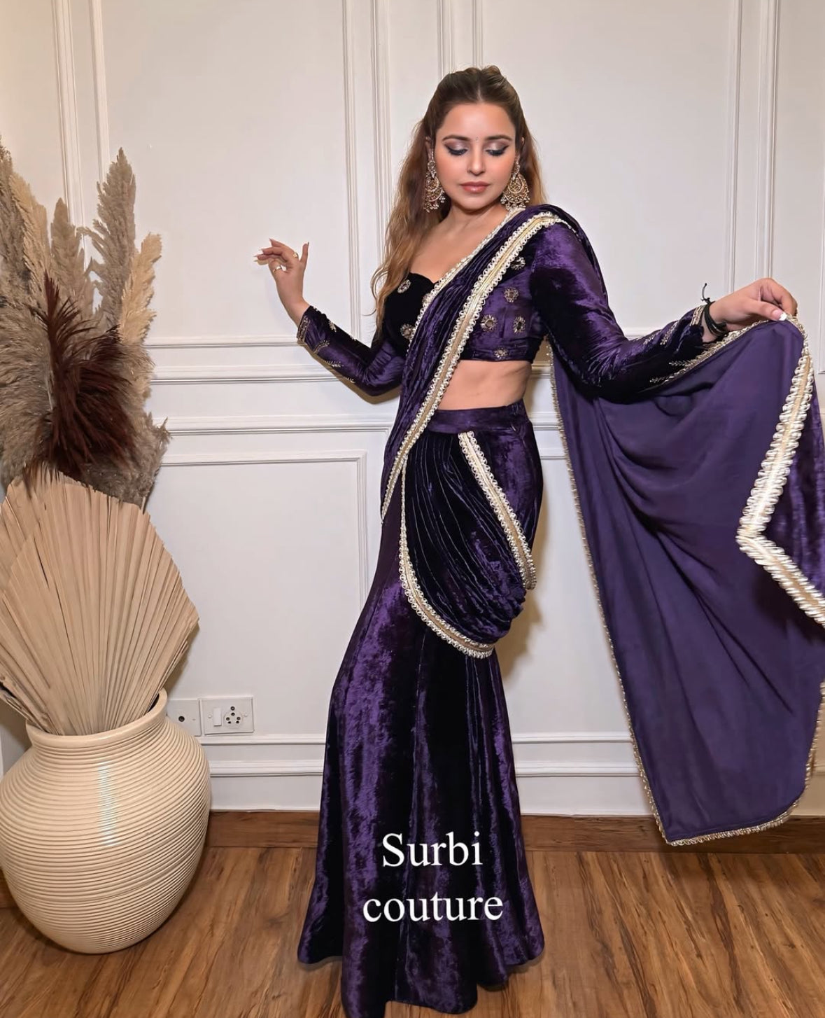Hand Embroidered Blouse Paired With A Pre Draped Lehenga Saree